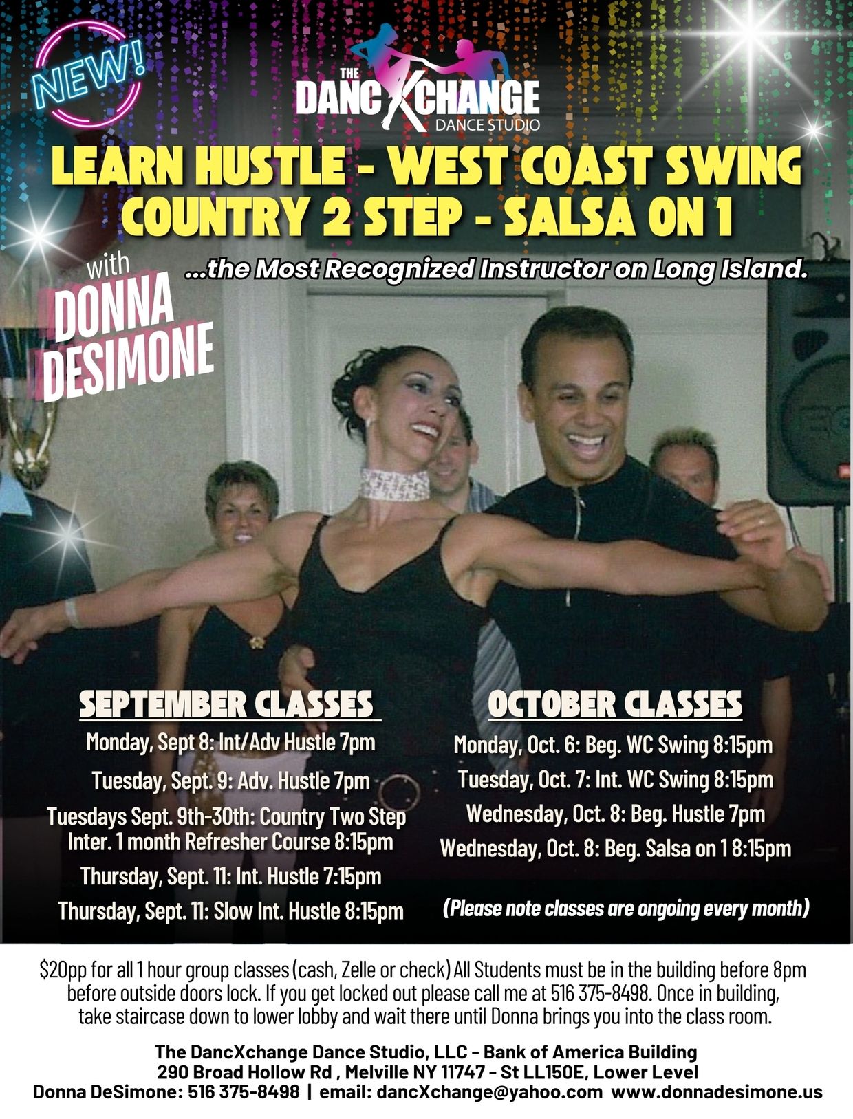 Currently Donna resides on Long Island NY. She is the proud owner of her own dance studio "The DancXchange, LLC . She runs and DJ's her monthly Hustle, West Coast Swing, Latin and Ballrooms dances under the name “The DancXchange "Club Night” in Suffolk and Nassau counties.